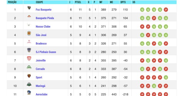 A segunda colocação é do Basquete Pinda, que tem a mesma campanha, com cinco triunfos e uma derrota, mas perde nos critérios de desempate. O terceiro lugar é do Nosso Clube, e o quarto é o São José dos Campos. Confira a classificação completa na foto abaixo.